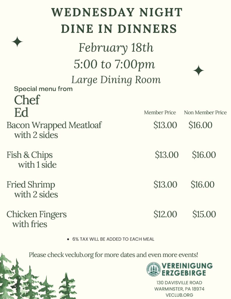 Wednesday Night dinners are available from 5-7pm in the large dining room monthly. Members $13. Non-members $16. Includes (1) Entrée and (2) Sides.
