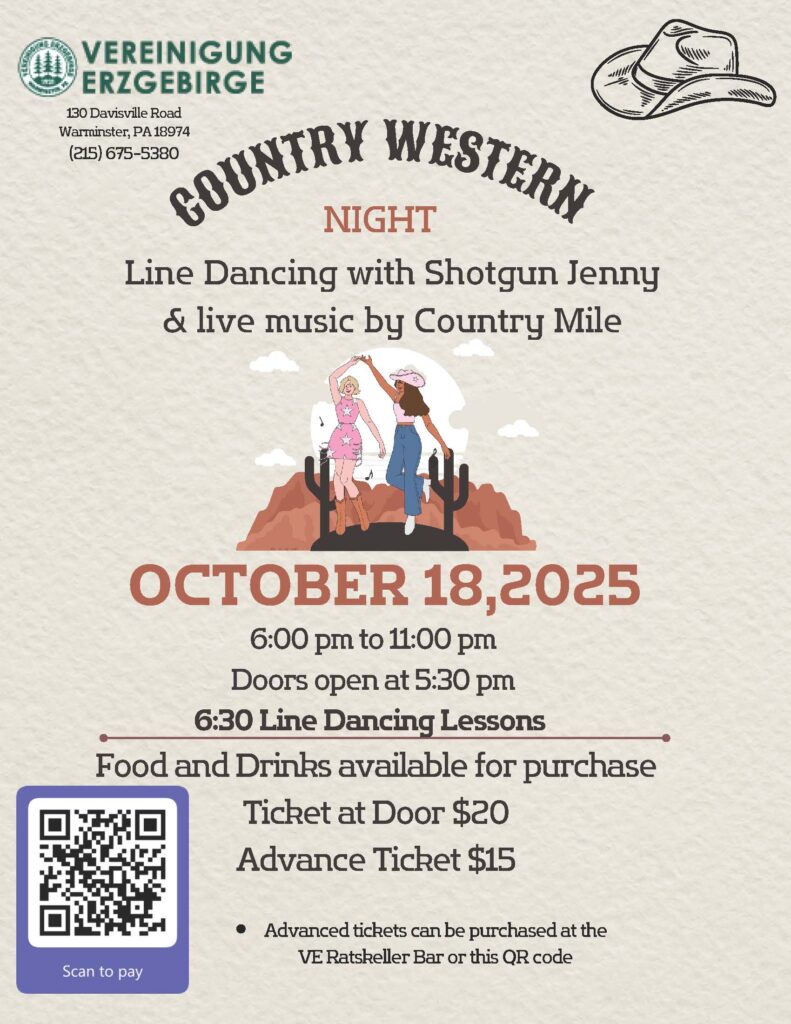 Country Western Night features Line Dancing with Shotgun Jenny and live music by Country Mile. October 18th, 2025 from 6:00pm to 11:00pm. Doors open at 5:30pm. Line dancing lessons begin at 6:30pm. Food and Drinks available for purchase. Tickets at the Door $20, purchase in advance $15. (Advanced Tickets can