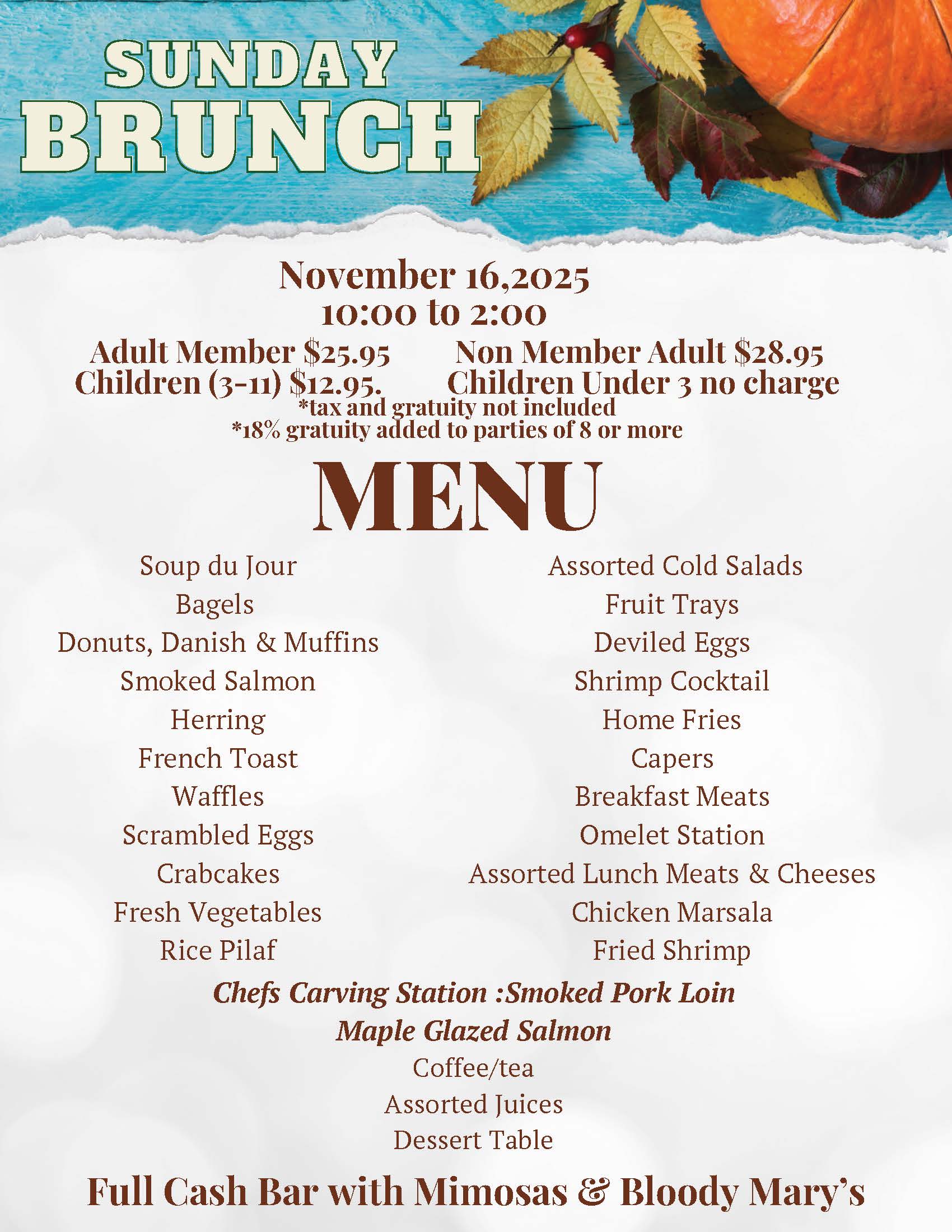 Sunday Brunch Buffet – November 16th2025 BRUNCH SCHEDULE Our fabulous Sunday brunches are back! Enjoy a delicious meal at the Club! An omelet station and all your breakfast and lunch favorites will be available. Reservations required in advance. Adult Member $25.95 / Non-Member Adult $28.95 / Children (3-11) $12.95 / Children (under 3) free Brunch Continue reading