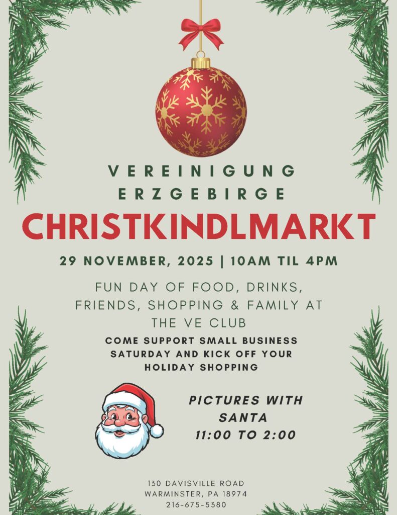 The most wonderful time of the year is just around the corner and we are so excited to announce the return of the Christkindlmarkt! Come join us Saturday November 29th from 10am-4pm for great food, drinks and all the wonderful gifts to buy for yourself or anyone on your list for this holiday season. From Christmas ornaments to nutcrackers, jewelry, children’s items, many handcrafted items you won’t find anywhere else and more. You won’t want to miss this event! If you are interested in being a vendor for this event please send email to VECLUBVENDORS@gmail.com to get an application form. Deadline for signing up as a vendor ends Friday November 16th. We hope to see you at our 2025 Christkindlmarkt.